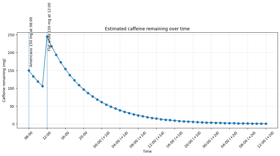 My flat white containing approximately 150 mg of caffeine will be combined with the remaining caffeine from my morning coffee. It’s probably easier to show this visually. Let’s assume a caffeine half-life of 6 hours, meaning it takes 6 hours to remove half of the caffeine consumed.