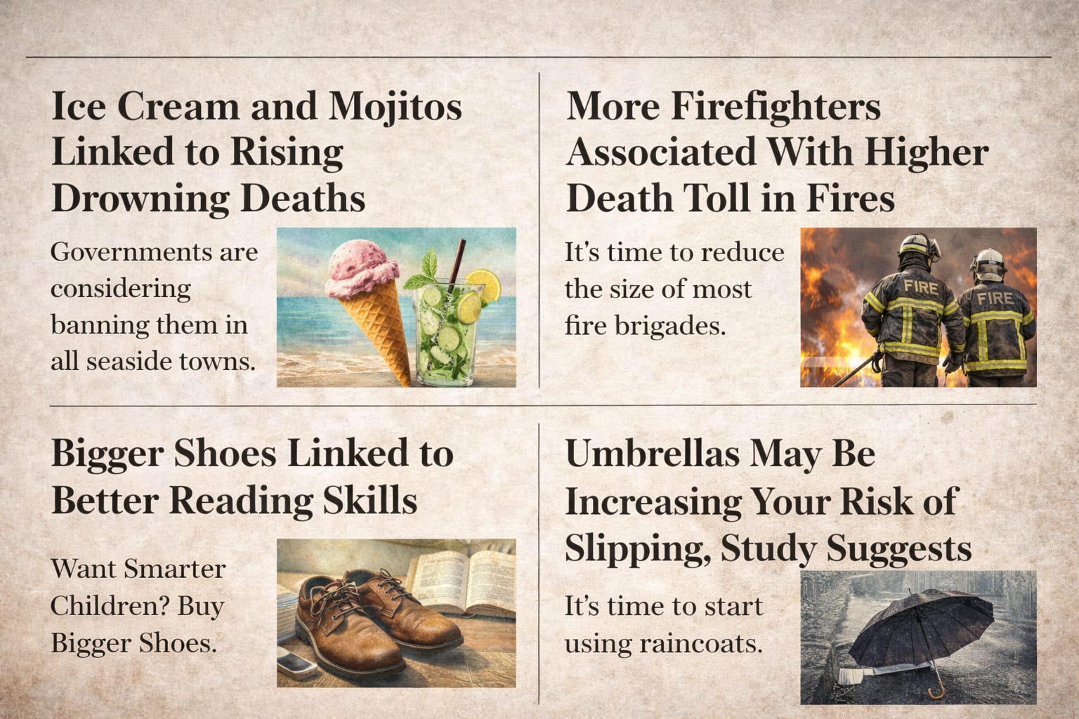 If correlation meant causation, we’d have to make very silly changes. Ban cold drinks, blame firefighters for fire deaths, totally prohibit umbrellas, and intentionally wear bigger shoes.